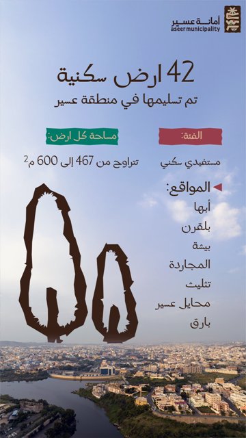 أعلنت أمانة منطقة عسير عن تسليم 42 أرض سكنية في سبعة مواقع تابعة لمنطقة عسير في خطوة جديدة نحو تمكين التملك ولتأسيس حياة مستقرة .