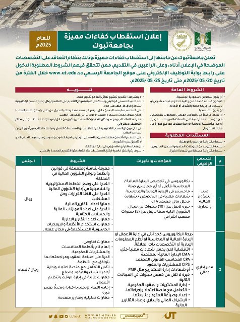 أعلنت #جامعة_تبوك عن حاجتها إلى استقطاب كفاءات مميزة، وذلك بنظام #التعاقد على الوظائف الموضحة في الإعلان أدناه، وعلى الراغبين في التقديم، ممن تتحقق فيهم الشروط المطلوبة الدخول على رابط بوابة #التوظيف الإلكتروني على موقع الجامعة الرسمي ut.edu.sa، خلال الفترة من تاريخ 20-5-2025م حتى تاريخ 25-5-2025م.