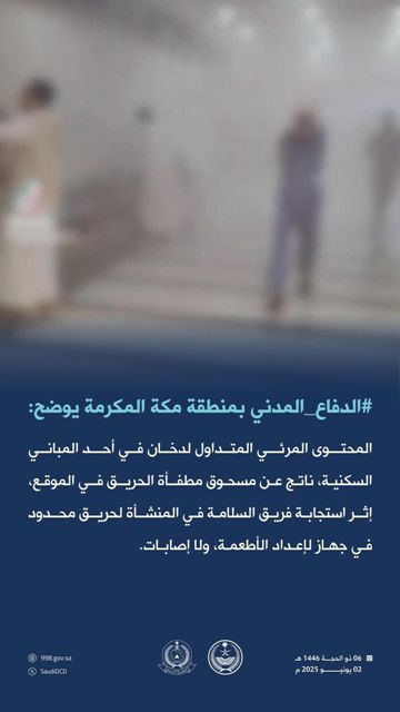 أوضح الدفاع المدني بمنطقة مكة المكرمة أن المحتوى المرئي المتداول عبر وسائل التواصل الاجتماعي، والذي يظهر تصاعد دخان من أحد المباني السكنية، يعود إلى مسحوق مطفأة الحريق المستخدمة في الموقع.