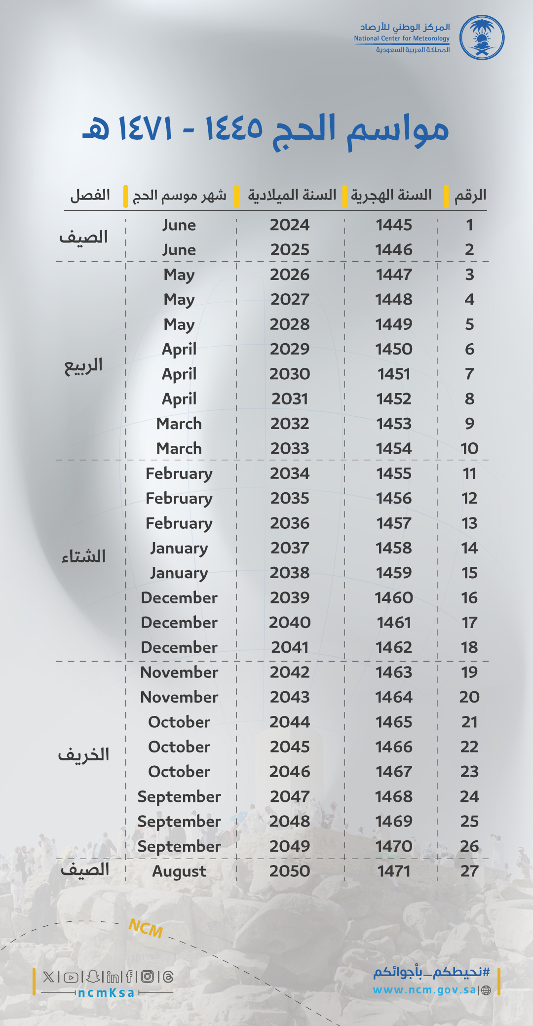 أكد المتحدث باسم المركز الوطني للأرصاد حسين القحطاني ان موسم الحج لهذا العام ١٤٤٦ سيكون اخر موسم في فصل الصيف وستبقى المواسم الثمانية القادمة في فصل الصيف .