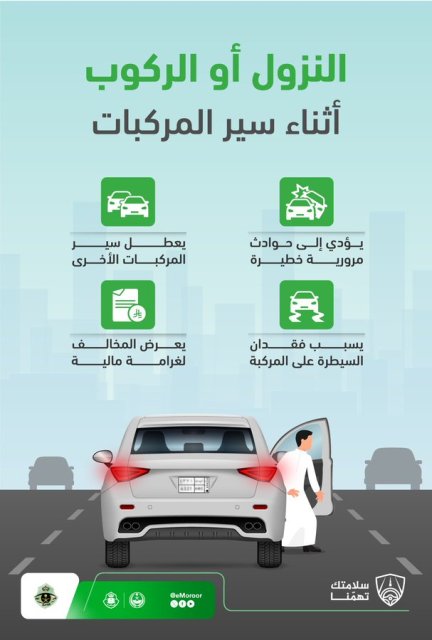 جددت الإدارة العامة للمرور تحذيرها من خطورة النزول أو الركوب أثناء سير المركبات، لما يشكله هذا السلوك من تهديد مباشر لسلامة الركاب ومستخدمي الطريق الآخرين – وأكدت الإدارة أن هذه الممارسة تندرج ضمن المخالفات المرورية التي قد تؤدي إلى عواقب وخيمة.