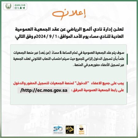 أعلن نادي ألمع الرياضي عن موعد انعقاد الجمعية العمومية العادية مساء يوم الأحـد الموافق: 1 / 9 /2024م في تمام الساعة 4 عصراً عبر منصة الجمعيات ( عن بعُد ) .