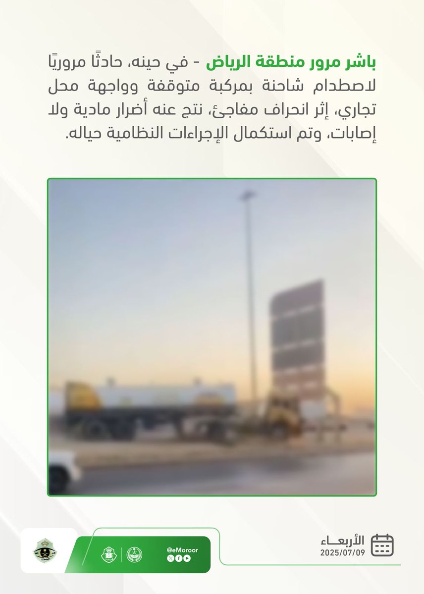 أكد مرور مدينة الرياض اليوم الأربعاء عن مباشرته في حينه حادثاً مرورياً لاصطدام شاحنة بمركبة متوقفة وواجهة محل تجاري إثر إنحراف مفاجئ نتج عنه أضرار مادية بدون إصابات وتم استكمال الإجراءات النظامية حيالها .