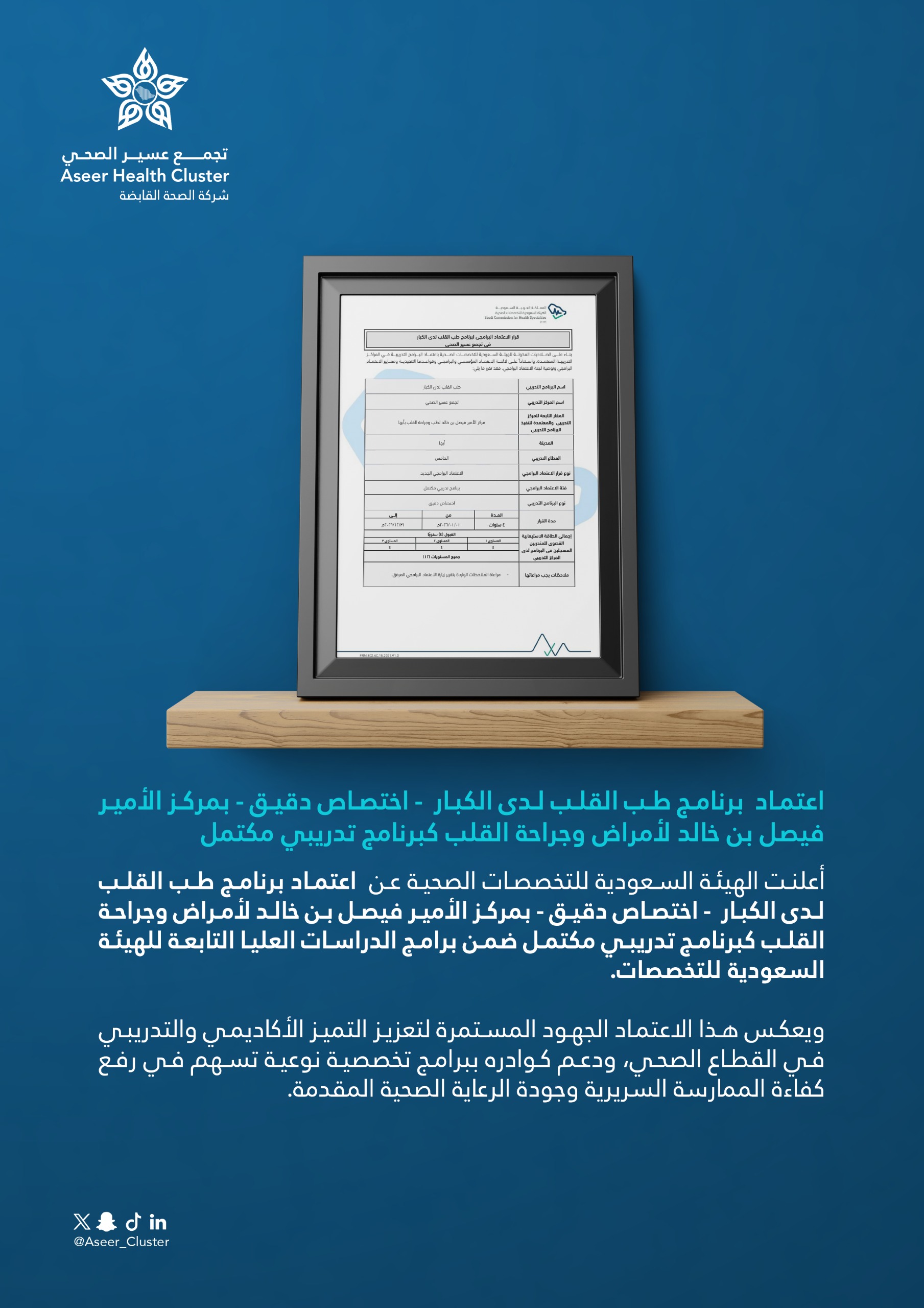أعلن تجمع عسير الصحي اعتماد برنامج طب القلب لدى الكبار – اختصاص دقيق – بمركز الأمير فيصل بن خالد لأمراض وجراحة القلب كبرنامج تدريبي مكتمل من الهيئة السعودية للتخصصات الصحية.