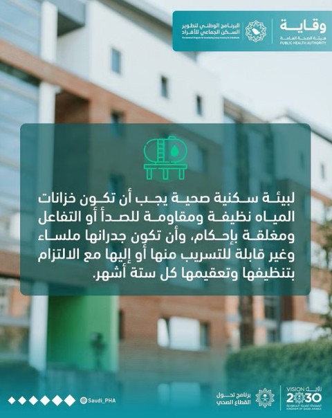 في إطار جهودها لتعزيز السلامة الصحية في المساكن الجماعية، أكدت هيئة الصحة العامة “وقاية” أهمية صيانة خزانات المياه بشكل دوري، مشيرة إلى ضرورة تنظيفها وتعقيمها مرة كل ستة أشهر على الأقل لضمان بيئة سكنية صحية وخالية من الملوثات.