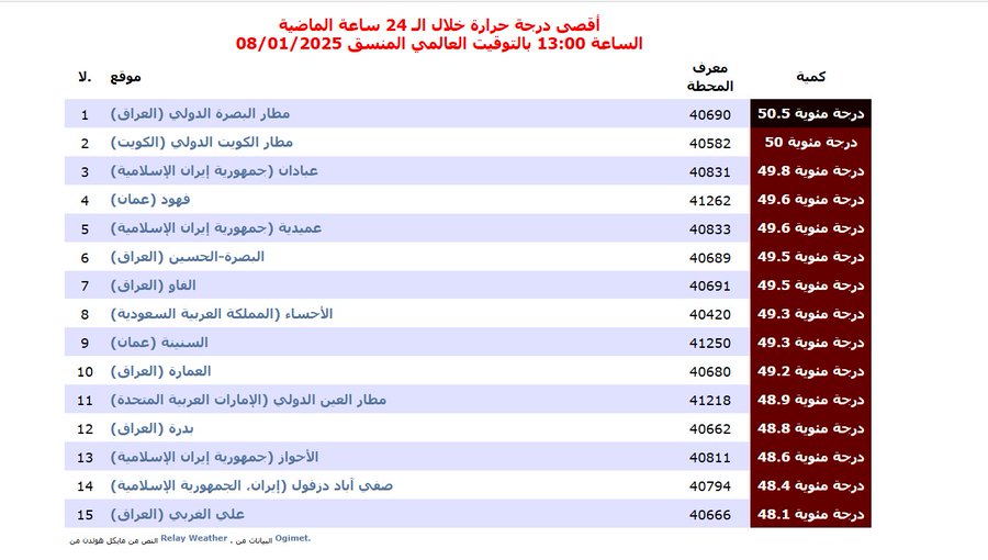 وقال الحصيني : مساء اليوم الجمعة 1447/2/7هـ الساعة السادسة بتوقيت السعودية أعلى حرارة سجلت في العالم خلال “24” ساعة الماضية المركز الأول مطار البصرة الدولي (العراق) 50.5°C المركز الثاني مطار الكويت الدولي (الكويت)50°C المركز الثالث عبادان (إيران)49.8°C الأحساء السعودية تحتل المركز الثامن 49.3°C .