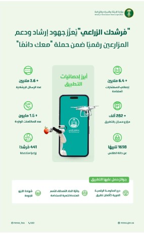 وأشارت إلى أن تطبيق “مرشدك الزراعي”، حقق العديد من المنجزات والجوائز منذ إطلاقه، وتميز بصفته واحدًا من أفضل التطبيقات الرقمية الخدمية في المنطقة؛ حيث حصل التطبيق على عدة جوائز، أبرزها، درع الحكومة الرقمية العربية كأفضل تطبيقٍ عربي، وجائزة اتحاد الأصدقاء للأمم المتحدة لتنمية الاستدامة، إضافةً إلى شهادة الآيزو للجودة، كما حقق التطبيق أرقامًا قياسية، من أبرزها تقديم أكثر من (6.4) ملايين استشارة فنية للمزارعين، كما تجاوز عدد المزارعين المسجلين في التطبيق (282) ألف مزارع، إلى جانب (441) مرشدًا متخصصًا، مبينةً أن التطبيق وردت إليه خلال الفترة المذكورة، أكثر من (1.5) مليون مكالمة صوتية، فيما تجاوز إجمالي عدد الرسائل النصية الإرشادية (3.6) ملايين رسالة، فيما بلغ عدد الاستشارات المقدمة لقسم اسأل عن نبات وآفة، أكثر من مليون استشارة، كما قدّم التطبيق للمزارعين نحو (1700) تنبيه عن حالة الطقس بحسب ما يعلن من المركز الوطني للأرصاد، و(687) حلقة بث مباشر إرشادية، إضافةً إلى (7945) خبرًا ومحتوىً إرشاديًا منشورًا، و (337) تحليلًا للتربة والمياه.