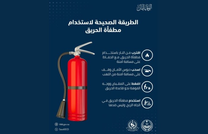 أكدت المديرية العامة للدفاع المدني أهمية اقتناء طفايات الحريق داخل المنازل، وضرورة تعلم الطرق الصحيحة لاستخدامها عند وقوع حوادث الحريق -لا قدر الله- حمايةً للإنسان، ومحافظةً على الممتلكات.