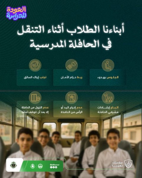 شددت الإدارة العامة للمرور على أهمية توعية الطلاب بالإرشادات المرورية أثناء تنقلهم في الحافلات المدرسية، مؤكدة أن الالتزام بالتعليمات يساهم بشكل مباشر في رفع مستوى السلامة المرورية.