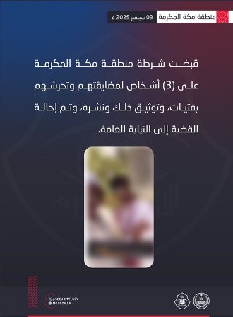 قبضت شرطة منطقة مكة المكرمة على ثلاثة أشخاص لمضايقتهم وتحرشهم بفتيات وتوثيق ذلك ونشره وتم إحالة القضية إلى النيابة العامة .