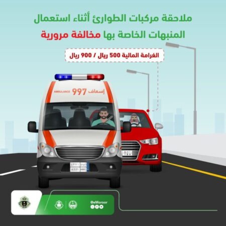 المرور : ملاحقة مركبات الطوارئ مخالفة قيمتها من 500 إلى 900 ريال