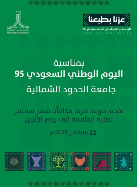 أعلنت جامعة الحدود الشمالية عن تقديم موعد صرف مكافأة شهر سبتمبر لطلبة الجامعة، ليكون يوم الإثنين 22 سبتمبر 2025م، وذلك تزامنًا مع احتفالات المملكة باليوم الوطني السعودي الـ95.