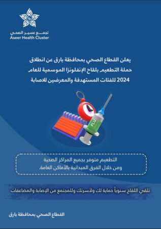 أعلن القطاع الصحي بمحافظة بارق انطلاق حملة التطعيم بلقاح الإنفلونزا الموسمية للعام 2024 م للفئات المستهدفة والمعرضين للإصابة – وبين القطاع الصحي ببارق بإن اللقاح متوفر بجميع المراكز الصحية ومن خلال الفرق الميدانية المتواجدة في الأماكن العامة .
