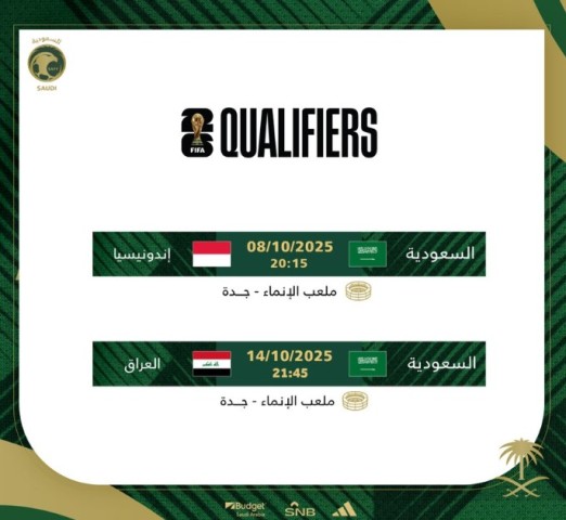 ووفق الجدول الرسمي الصادر عن الاتحاد، يستهل الأخضر مشواره في التصفيات بمواجهة منتخب إندونيسيا يوم الأربعاء 8 أكتوبر 2025 عند الساعة 8:15 مساءً على ملعب الإنماء بمدينة الملك عبدالله الرياضية في جدة، فيما يخوض مباراته الثانية أمام منتخب العراق يوم الثلاثاء 14 أكتوبر 2025 على الملعب ذاته عند الساعة 9:45 مساءً.