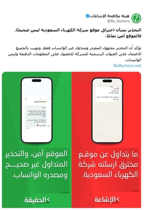 وقالت الهيئة في توضيح لها : التحذير بشأن اختراق موقع شركة الكهرباء السعودية ليس صحيحًا، فالموقع آمن تمامًا ونؤكد أن التحذير مجهول المصدر ومتداول عبر الواتساب فقط، ونهيب بالجميع الاعتماد على القنوات الرسمية للشركة للحصول على المعلومات الدقيقة وليس الواتساب.