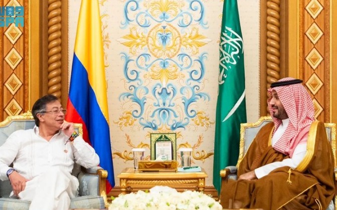 وجرى خلال اللقاء، استعراض العلاقات الثنائية بين البلدين وفرص التعاون المشترك في مختلف المجالات – حضر اللقاء، صاحب السمو الأمير فيصل بن فرحان بن عبدالله وزير الخارجية، ومعالي وزير الاستثمار المهندس خالد الفالح، ومعالي سكرتير سمو ولي العهد الدكتور بندر بن عبيد الرشيد، والقائم بأعمال سفارة خادم الحرمين الشريفين لدى جمهورية كولومبيا محمد الشاطري.