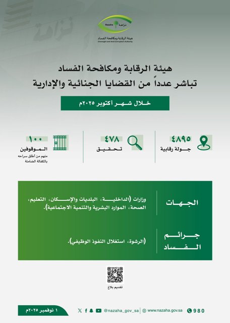 أعلنت هيئة الرقابة ومكافحة الفساد (نزاهة) مباشرتها عدداً من القضايا الجنائية والإدارية خلال شهر أكتوبر 2025، في إطار جهودها المستمرة لحماية المال العام ومكافحة الفساد بجميع أشكاله.