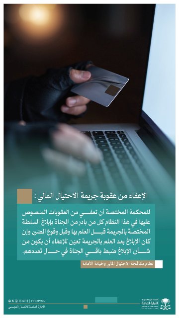 أوضحت النيابة العامة أن مبادرة الجاني في جريمة الاحتيال المالي بالإبلاغ عنها قبل اكتشافها أو قبل وقوع الضرر تتيح للمحكمة المختصة النظر في إعفائه من العقوبة المنصوص عليها في النظام.
