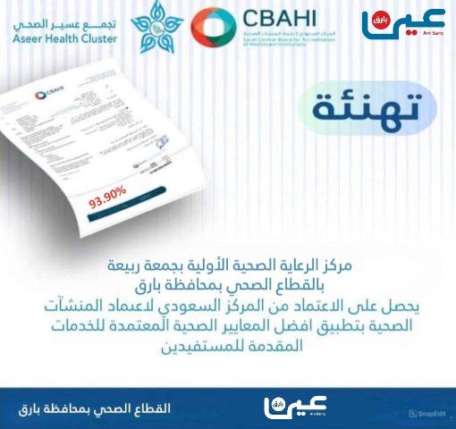 هنئ تجمع عسير الصحي مركز الرعاية الصحية الأولية بمركز جمعة ربيعة التابع لمحافظة بارق بعد حصوله على الاعتماد من المركز السعودي لاعتماد المنشآت الصحية بتطبيق أفضل المعايير الصحية المعتمدة للخدمات المقدمة للمستفيدين .