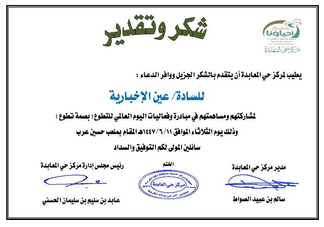 تلقت ” عين ” الإخبارية  شهادة شكر وتقدير من مركز ” حي المعابدة ”  نظير مشاركتها ومساهمتها في مبادرة وفعاليات اليوم العالمي للتطوع ” بصمة تطوع ” والذي يؤكد دعم الصحيفة لكل الفعاليات والمناشط المجتمعية .