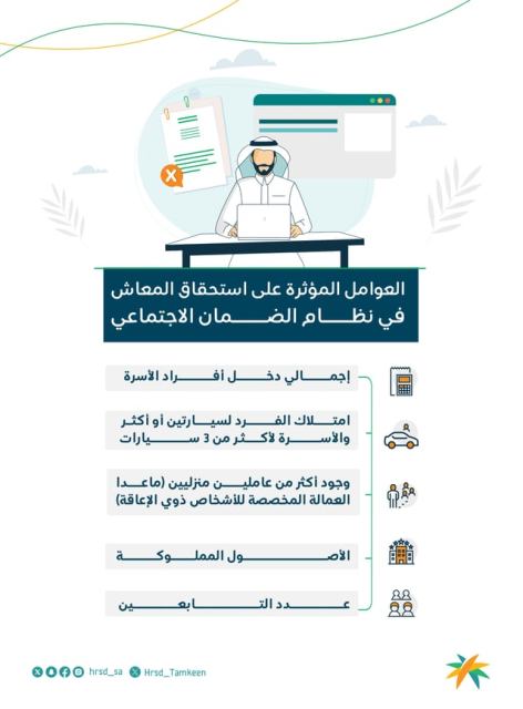 وأوضح الضمان الاجتماعي أن إجمالي دخل الأسرة، وامتلاك الفرد سيارتين أو أكثر، والأسرة أكثر من 3 سيارات، من العوامل المؤثرة على استحقاق المعاش في نظام الضمان.