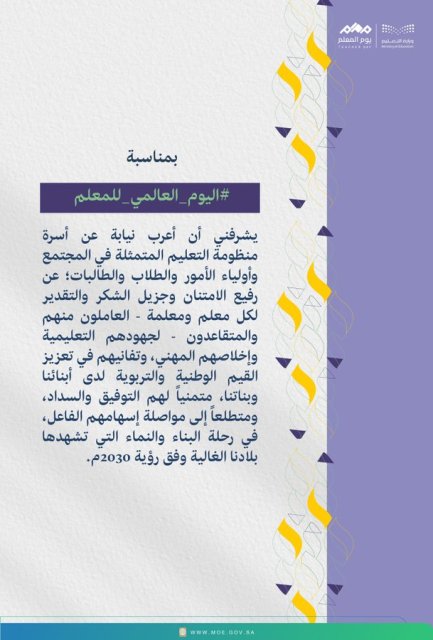 هنئ وزير التعليم يوسف بن عبدالله البنيان المعلمين والمعلمات في اليوم العالمي للمعلم والذي يصادف الخامس من أكتوبر في كل عام والتي تشارك فيه المملكة ممثلة في وزارة التعليم مثيلاتها من الدول هذه المناسبة بهدف تسليط الضوء على إنجازات المُعلمين وأهمية التعليم؛ حيث تمّ تحديد هذا اليوم من قِبل منظمة الأمم المتحدة للتربية والعلم والثقافة “اليونسكو” في عام 1994م.