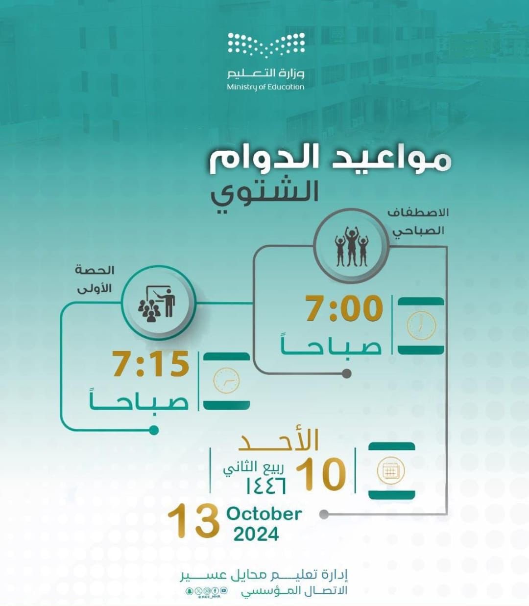 اعتمد مُـديـر تعليم محايل عسير الاستاذ علي بن أحمد ال معنتر مواعيد الدوام الشتوي في جميع مكاتب و مدارس تعليم محايل عسير ابتداءً من يوم الأحد الموافق 10 / 04 / 1446هـ 13 / 10 / 2024 م .