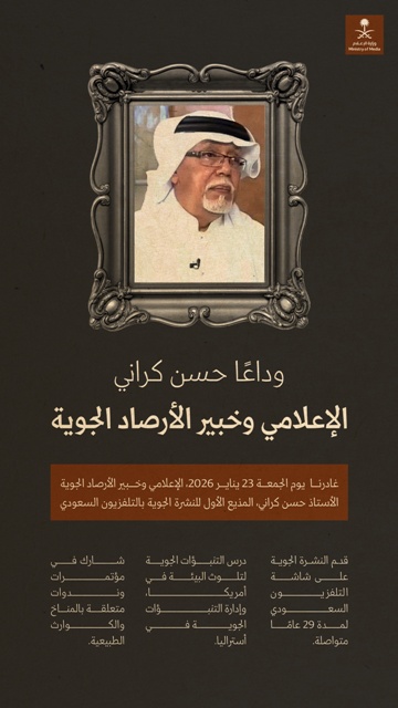 ودع معالي وزير الإعلام السعودي سلمان الدوسري صوت الأرصاد الجوية حسن مصطفى كراني الذي وافته المنية صباح اليوم الجمعة 4 شعبان 1447هـ بعد معاناة مع المرض وذلك عبر حسابه في منصة أكس .
