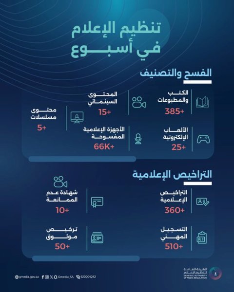 وأوضحت أنه تم فسح وتصنيف 385 من الكتب المطبوعة، و25 لعبة إلكترونية، و66 ألف جهاز إعلامي – وأشارت إلى إصدار 360 ترخيصًا إعلاميًّا، و10 شهادات عدم ممانعة، و510 تسجيلات مهنية، و50 ترخيصاً موثوقاً.