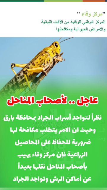 وقال المركز في تنبيه له : نظراً لتواجد أسراب الجراد بمحافظة بارق وحيث أن الأمر يتطلب مكافحة ضرورية لها للحفاظ على المحاصيل الزراعية فأن مركز وقاء يهيب بأصحاب المناحل نقلها بعيداً عن أماكن الرش وتواجد الجراد .