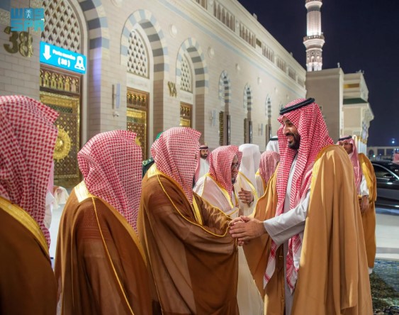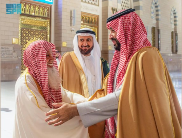 وكان في استقبال سمو ولي العهد لدى وصوله الحرم النبوي، معالي رئيس الشؤون الدينية بالمسجد الحرام والمسجد النبوي الشيخ الدكتور عبدالرحمن بن عبدالعزيز السديس، ومعالي وزير الحج والعمرة الدكتور توفيق بن فوزان الربيعة، وأصحاب الفضيلة أئمة وخطباء المسجد النبوي.