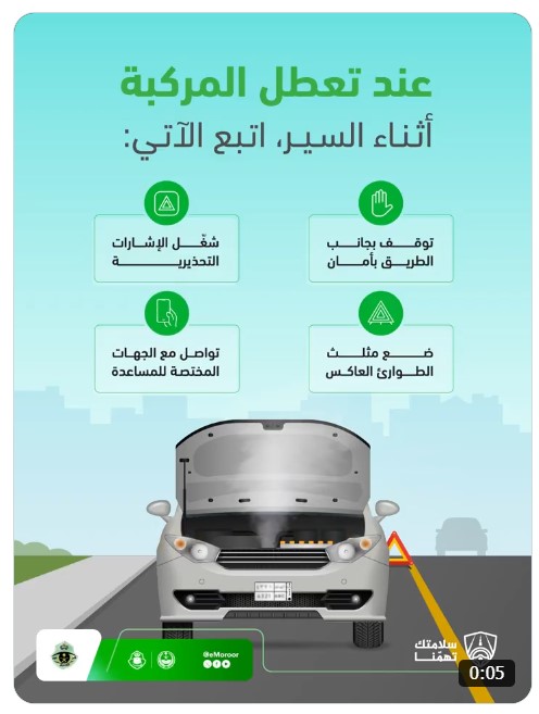 أوضحت الإدارة العامة للمرور عبر أنفوجرافيك لها بمنصة التواصل الإجتماعي أكس ما يجب على قائد المركبة فعله خلال تعطل مركبته أثناء السير : وبينت الإدارة أربع خطوات عند تعطل المركبة في الطريق وهي : 1 / توقف بجانب الطريق بأمان 2 / شغل الإشارات التحذيرية 3 / ضع مثلث الطوارئ العاكس 4 / تواصل مع الجهات المختصة للمساعدة .
