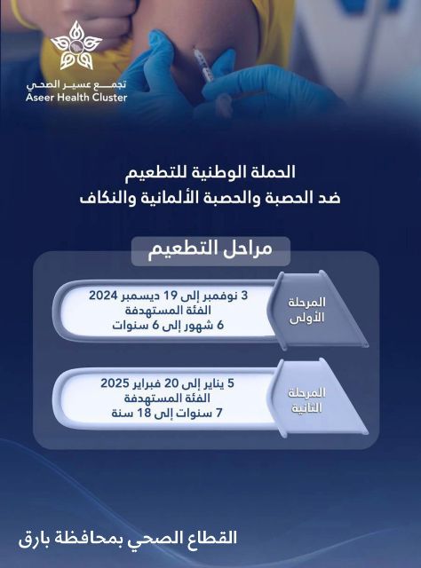 أعلن القطاع الصحي بمحافظة بارق انطلاق الحملة الوطنية للتطعيم ضد الحصبة والحصبة الألمانية والنكاف وفق مرحلتين .