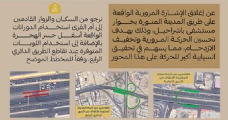 أعلنت أمانة العاصمة المقدسة وبالتعاون مع إدارة المرور بالعاصمة المقدسة عن إغلاق الإشارة الواقعة على طريق المدينة المنورة بجوار مستشفى باشراحيل وذلك بهدف تحسين الحركة المرورية وتخفيف الازدحام مما يسهم في تحقيق انسيابية أكبر للحركة على هذا المحور .