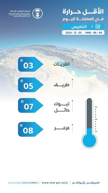 سجّلت محافظة القريات بمنطقة الجوف، اليوم الخميس، أقل درجة حرارة في المملكة، حيث بلغت 3 درجات مئوية، تلتها محافظة طريف بمنطقة الحدود الشمالية بـ 5 درجات مئوية – وسجّلت تبوك وحائل 7 درجات، فيما سجّلت عرعر 8 مئوية.