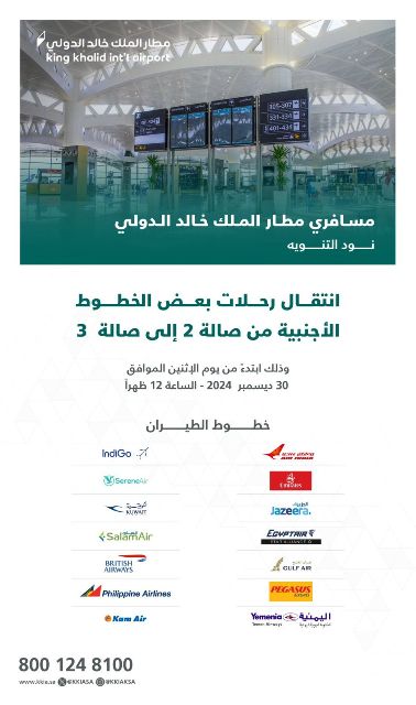 نوه مطار الملك خالد عبر حسابه في أكس بقوله : أعزاءنا المسافرين عبر #مطار_الملك_خالد الدولي، نود أن نلفت عنايتكم إلى أنه سيتم نقل رحلات بعض الخطوط الأجنبية من صالة السفر الدولية 2 إلى صالة السفر الدولية 3، وذلك اعتباراً من الساعة 12 من ظهر يوم الإثنين الموافق 30 ديسمبر.