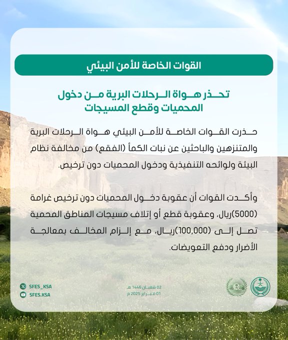 حذرت القوات الخاصة للأمن البيئي هواة الرحلات البرية والمتنزهين والباحثين عن نبات الكمأ (الفقع) من مخالفة نظام البيئة ولوائحه التنفيذية ودخول المحميات دون ترخيص.
