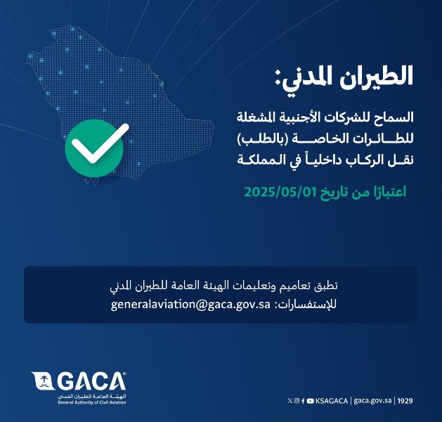 وبناءً على هذا تمنح الهيئة العامة للطيران المدني، التصريح لشركات الطيران الخاص الأجنبية (بالطلب) لنقل الركاب عبر الرحلات غير المجدولة داخليًا بعد استيفاء مقدم الطلب للمتطلبات التي تحددها الهيئة، وذلك ابتداءً من تاريخ 1 / 5 / 2025م.