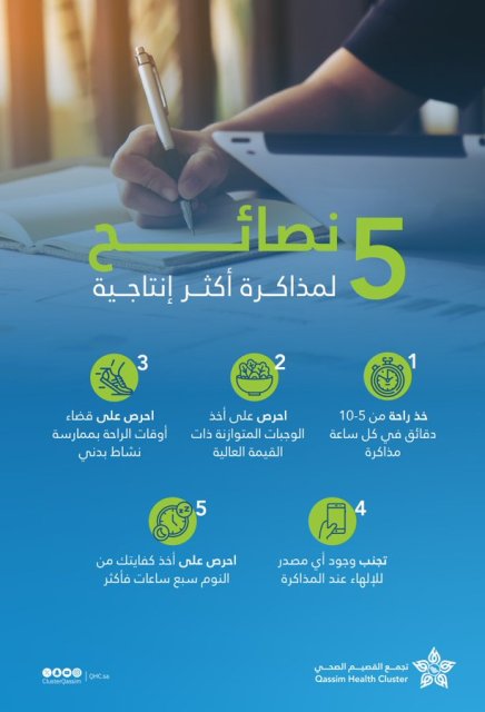 أكد تجمُّع صحي القصيم، أهمية اتباع عادات صحية تُسهم في تحسين تركيز الطلاب وزيادة إنتاجيتهم خلال فترات الاستذكار، مشيراً إلى أن التخطيط الجيد وتنظيم الوقت بذكاء يُسهمان في تحقيق نتائج أكاديمية متميزة. وأوضح التجمُّع أن أخذ فترات راحة قصيرة تراوح بين خمس وعشر دقائق لكل ساعة استذكار يساعد على تعزيز قدرة الدماغ على الاستيعاب وتقليل الإرهاق الذهني، مما يرفع كفاءة التحصيل العلمي.