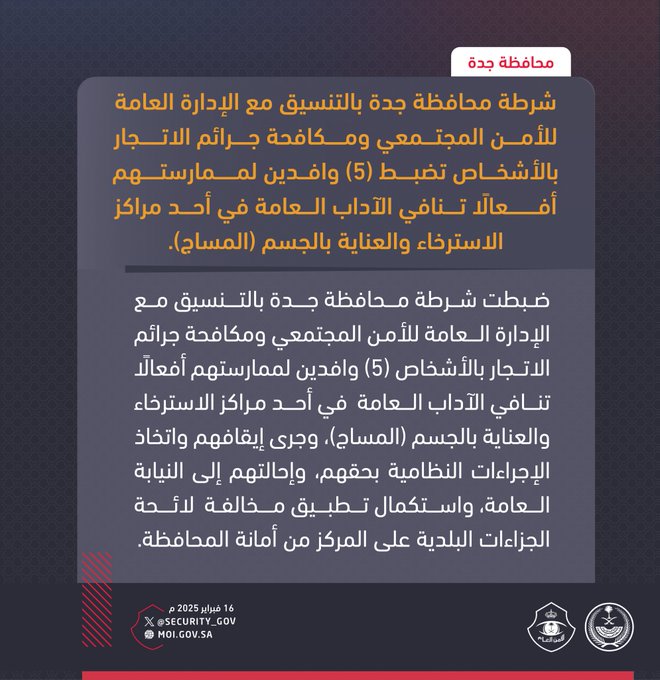 تمكنت شرطة محافظة جدة، بالتنسيق مع الإدارة العامة للأمن المجتمعي ومكافحة جرائم الاتجار بالأشخاص، من ضبط خمسة وافدين تورّطوا في ممارساتٍ تتنافى مع الآداب العامة داخل أحد مراكز الاسترخاء والعناية بالجسم (المساج).