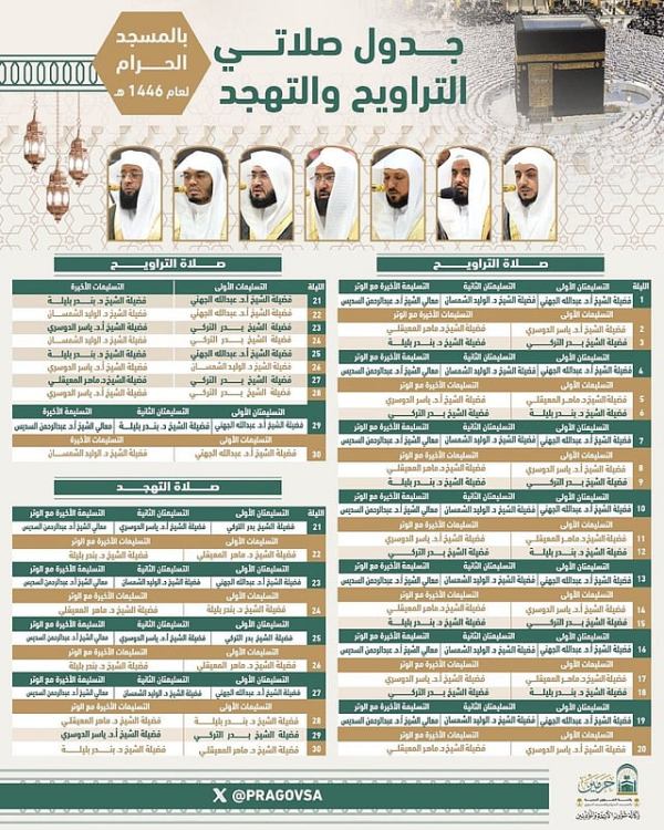 اعتمد رئيس الشؤون الدينية بالمسجد الحرام والمسجد النبوي الشيخ الدكتور‫ عبدالرحمن السديس جدول صلاتي التراويح والتهجد بالمسجد الحرام والمسجد النبوي خلال شهر رمضان المبارك لهذا العام 1446هـ. ‏