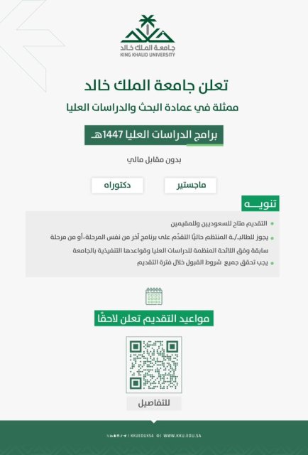 أعلنت #جامعة_الملك_خالد ممثلة في عمادة البحث والدراسات العليا عن إتاحة برامج الدراسات العليا الماجستير والدكتوراه (دون مقابل مالي) للعام الجامعي القادم 1447 وشروط الالتحاق بها، وسيتم في إعلان لاحق تحديد مواعيد القبول..