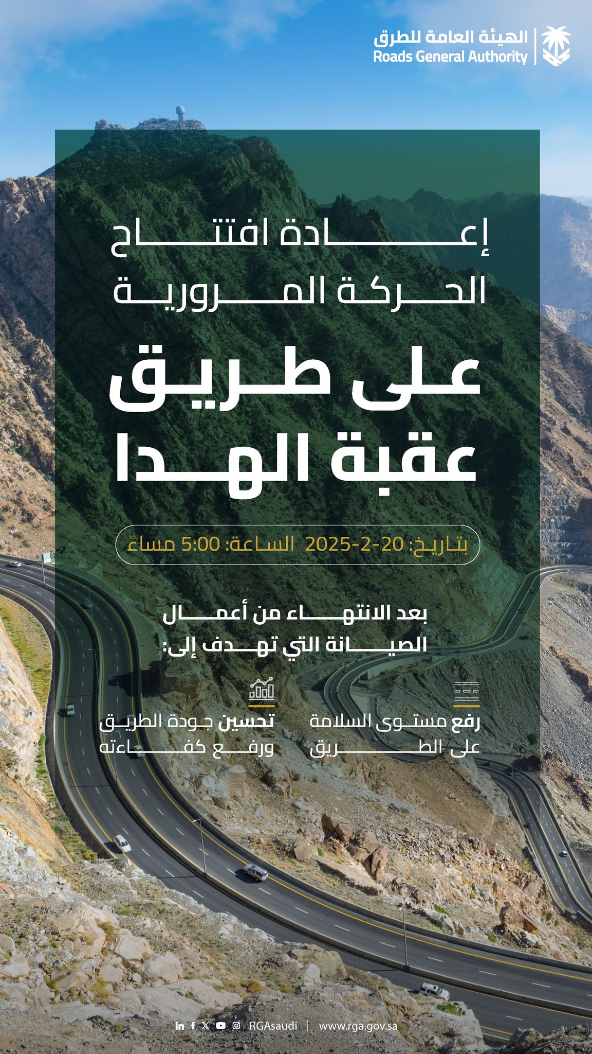 أعلنت الهيئة العامة للطرق اليوم الثلاثاء عن إعادة افتتاح الحركة المرورية بطريق عقبة الهدا وذلك بعد انتهاء اعمال الصيانة التي تهدف إلى رفع مستوى السلامة على الطريق وتحسين جودة الطريق ورفع كفاءته وذلك بتاريخ الخميس 20 / 2 / 2025 م الساعة الخامسة عصراً .