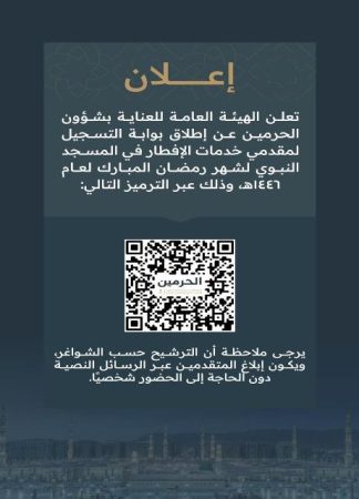 أعلنت الهيئة العامة للعناية بشؤون الحرمين اليوم عن إطلاق بوابة التسجيل لمقدمي خدمات الإفطار بالمسجد النبوي خلال شهر رمضان المبارك 1446هـ وأوضحت الهيئة أن التقديم يتم عبر الرابط :
