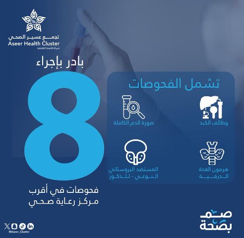 أكد تجمع عسير الصحي على المبادرة لكل شخص بإجراء 8 فحوصات مخبرية مهمة في اقرب مركز للرعاية الصحية الأولية وذلك عن طريق حجز موعد من خلال تطبيق صحتي، والنتائج تظهر خلال ٢٤ ساعة.