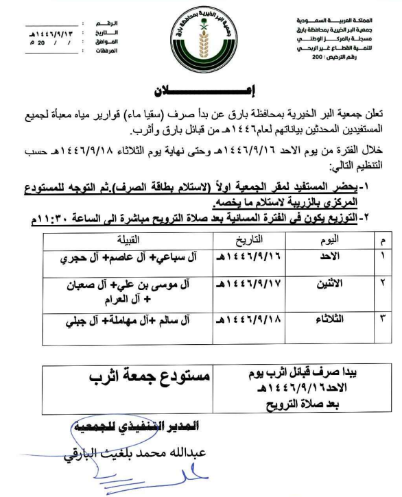 أعلنت جمعية البر الخيرية بمحافظة بارق عن بدأ صرف ( سقيا مياه ) قوارير مياه معبأة لجميع المستفيدين المحدثين بياناتهم لعام 1446هـ من قبائل بارق وأثرب خلال الفترة من يوم الأحد 16 رمضان 1446هـ وحتى نهاية يوم الثلاثاء 18 رمضان 1446هـ على حسب إعلان الجدول التالي :