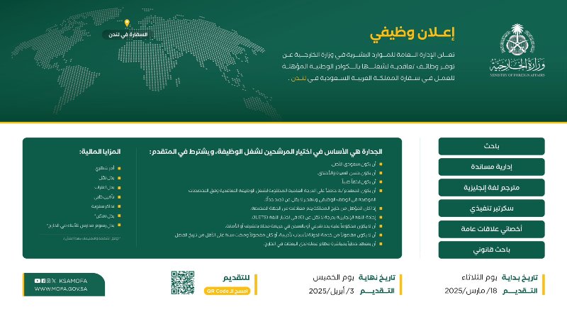 وأشارت الوزارة إلى أن المتقدمين سيحظون بمزايا مالية تشمل راتباً شهرياً، بدل نقل، بدل اغتراب، تأمين طبي، تذاكر سنوية، بدل سكن، وبدل رسوم مدارس الأبناء في الخارج وفق الأنظمة المعمول بها.