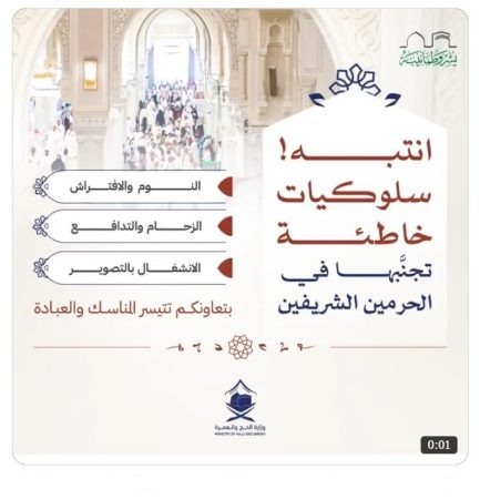 دعت وزارة الحج والعمرة جميع المعتمرين والزوار إلى الالتزام بالنظام، وتجنُّب السلوكيات الخاطئة التي قد تؤثر على سير المناسك، وتعيق راحة الآخرين.