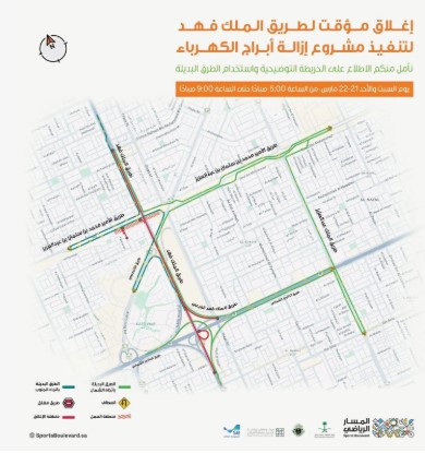 أعلن مشروع المسار الرياضي عن إغلاق مؤقت لطريق الملك فهد بين الدائري الشمالي وطريق الأمير محمد بن سلمان بن عبدالعزيز
