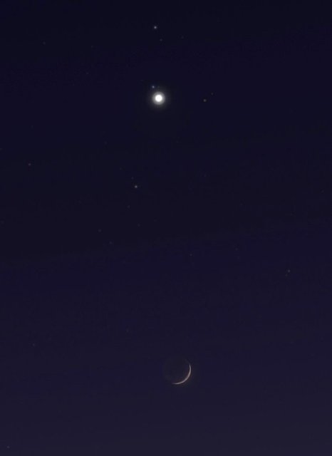 يُرصد بعد غروب شمس اليوم، والانتقال نحو بداية الليل, اصطفاف هلال القمر بكوكب الزهرة بالأفق الجنوبي الغربي في ظاهرة مشاهدة
